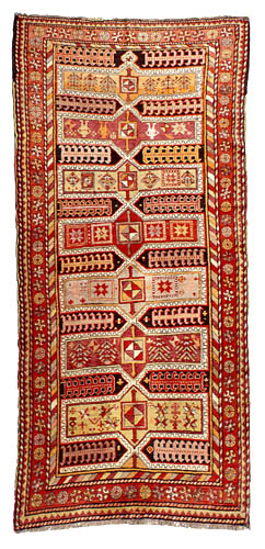 Die sonst rhombischen Karagashli-Motive sind bei diesem Kaukasen quadratisch gehalten. Sie werden an vier Seiten von stilisierten Gabelrauten umschlossen. Zwischen den Rauten hat der Karagashli beidseitig abstrahierte, helle Kreuzblüten. Die Hauptbordüre ist mit dem Adlerschnabelmotiv gemustert; flankiert wird sie vom Barbier-Stangen-Muster. Wolle auf Wolle, in gutem Zustand.